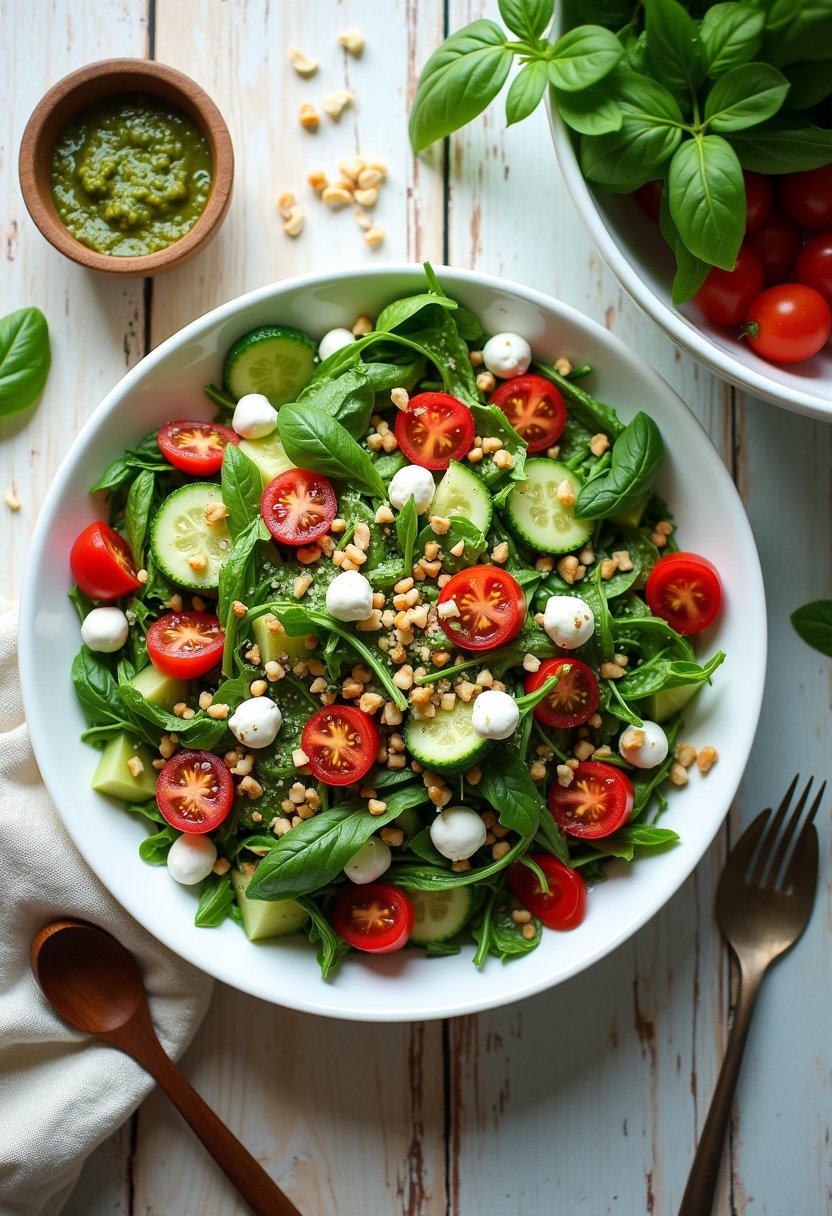 Pour the fresh pesto over the salad ingredients in the bowl. Use a large spoon or your hands (clean, of course) to gently toss everything together. Make sure each piece is coated with the pesto, ensuring that every bite is a burst of flavor. You’ll notice the vibrant colors meld into a beautiful medley, hinting at the deliciousness to come. - Taste and Adjust